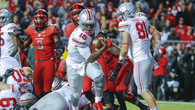Oct 24, 2015; Piscataway, NJ, USA; Ohio State Buckeyes quarterback J.T. Barrett (16) crosses the goal line for second quarter touchdown against the Rutgers Scarlet Knights at High Points Solutions Stadium. Mandatory Credit: Jim O’Connor-USA TODAY Sports