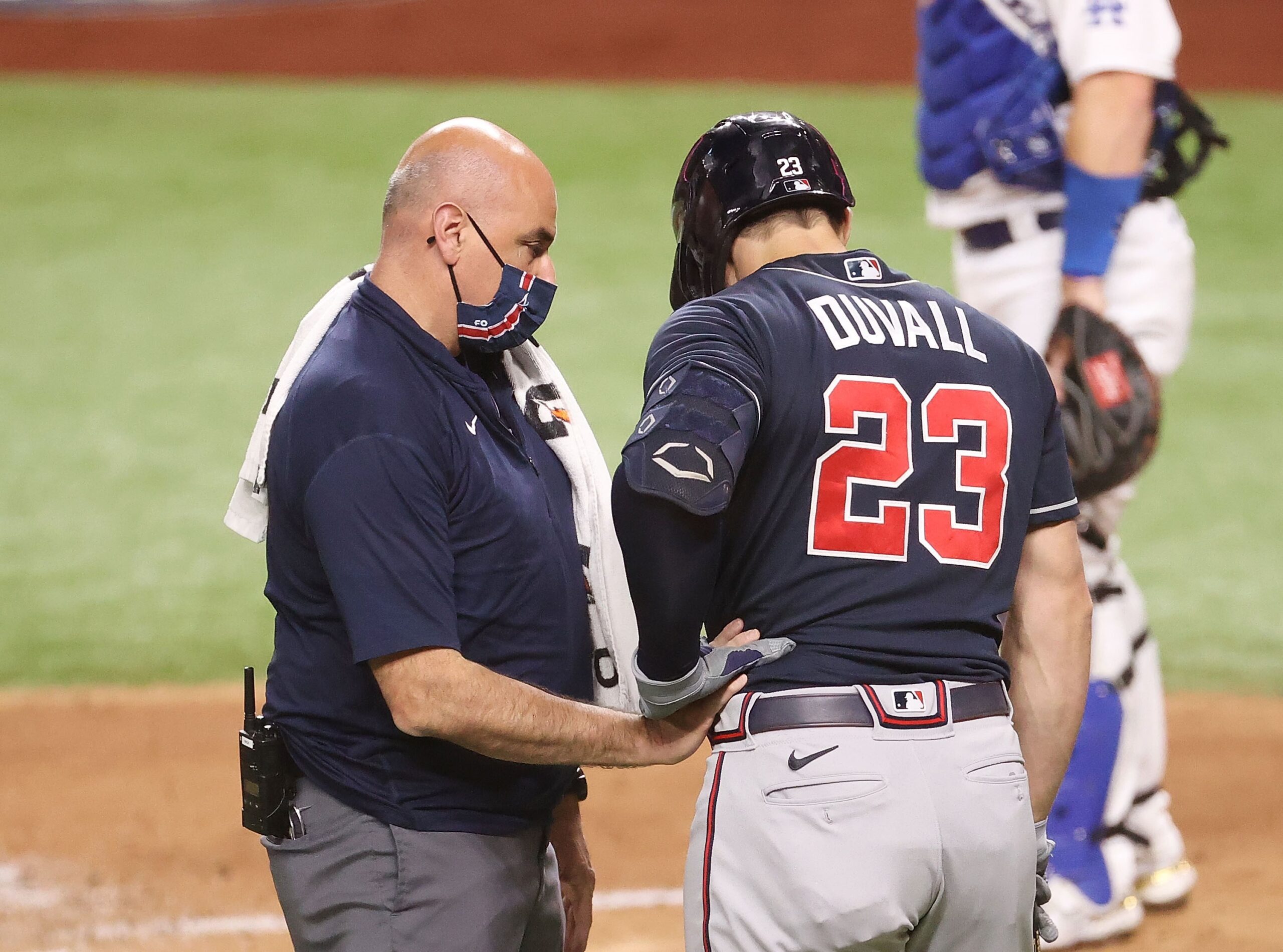 Duvall, 32, sustained the injury to his left side when he fouled off a pitch in the second inning of Monday’s 5-1 win over the Los Angeles Dodgers in Game 1 in Arlington, Texas. He left the game and was replaced by Cristian Pache.