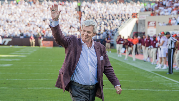 Sep 23, 2017; Blacksburg, VA, USA; Longtime Virginia Tech Hokies head coach Frank Beamer waves to the crowd after the fourth quarter against the Old Dominion Monarchs at Lane Stadium. Photo Credit: Lee Luther Jr.-USA TODAY Sports