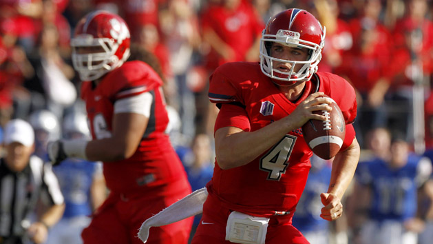 Playing at home against Air Force, the junior signal caller completed 28 of 32 passes, connecting on 87.5 percent of his throws, for 452 yards and four touchdowns with no interceptions. The 48-15 victory earned Fresno State a share of the Mountain West championship in its first year in the league.