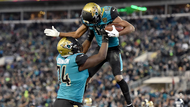 Dec 10, 2017; Jacksonville, FL, USA; Jaguars wide receiver Dede Westbrook (right) celebrates with offensive tackle Cam Robinson (left) after scoring a touchdown against the Seattle Seahawks during the second half at EverBank Field. Photo Credit: Steve Mitchell-USA TODAY Sports