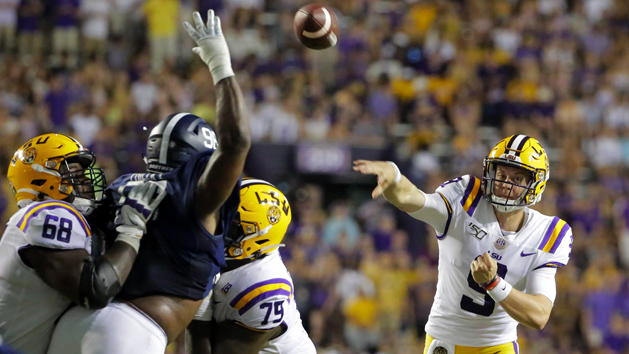 LSU’s high-powered offense lived up to expectations, scoring 45 points with the starters in the game as Joe Burrow tied a school record with five TD passes. Fourteen players caught passes for the Tigers, and LSU outgained Georgia Southern 472-98.