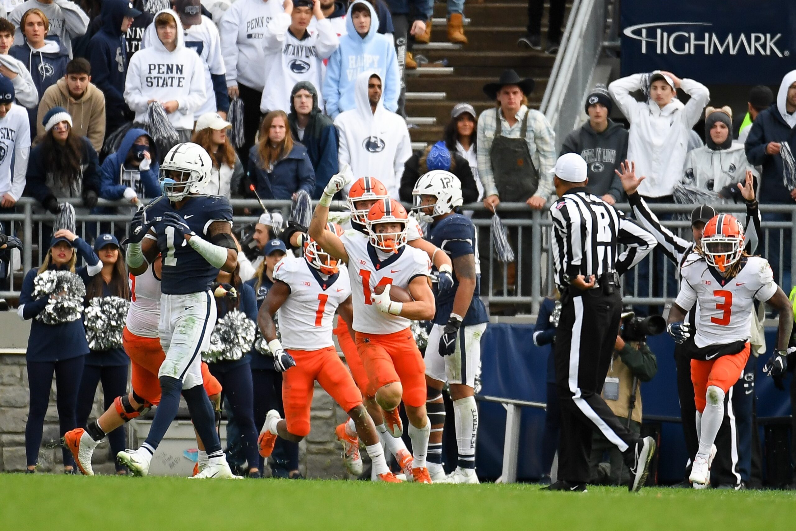 The final score in State College was Illinois 20, Penn State 18. The reason for this low score … After the second overtime, neither team could even gain three yards in overtimes 3, 4, 5, 6, 7 or 8. Finally, on the Illini’s seventh try, they gained three yards.