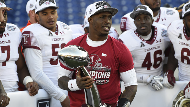Dec 3, 2016; Annapolis, MD, USA; Temple Owls quarterback Phillip Walker (8) holds American Athletic Conference football trophy during a post game celebration after defeating Navy Midshipmen 34-10 at Navy-Marine Corps Memorial Stadium. Photo Credit: Tommy Gilligan-USA TODAY Sports