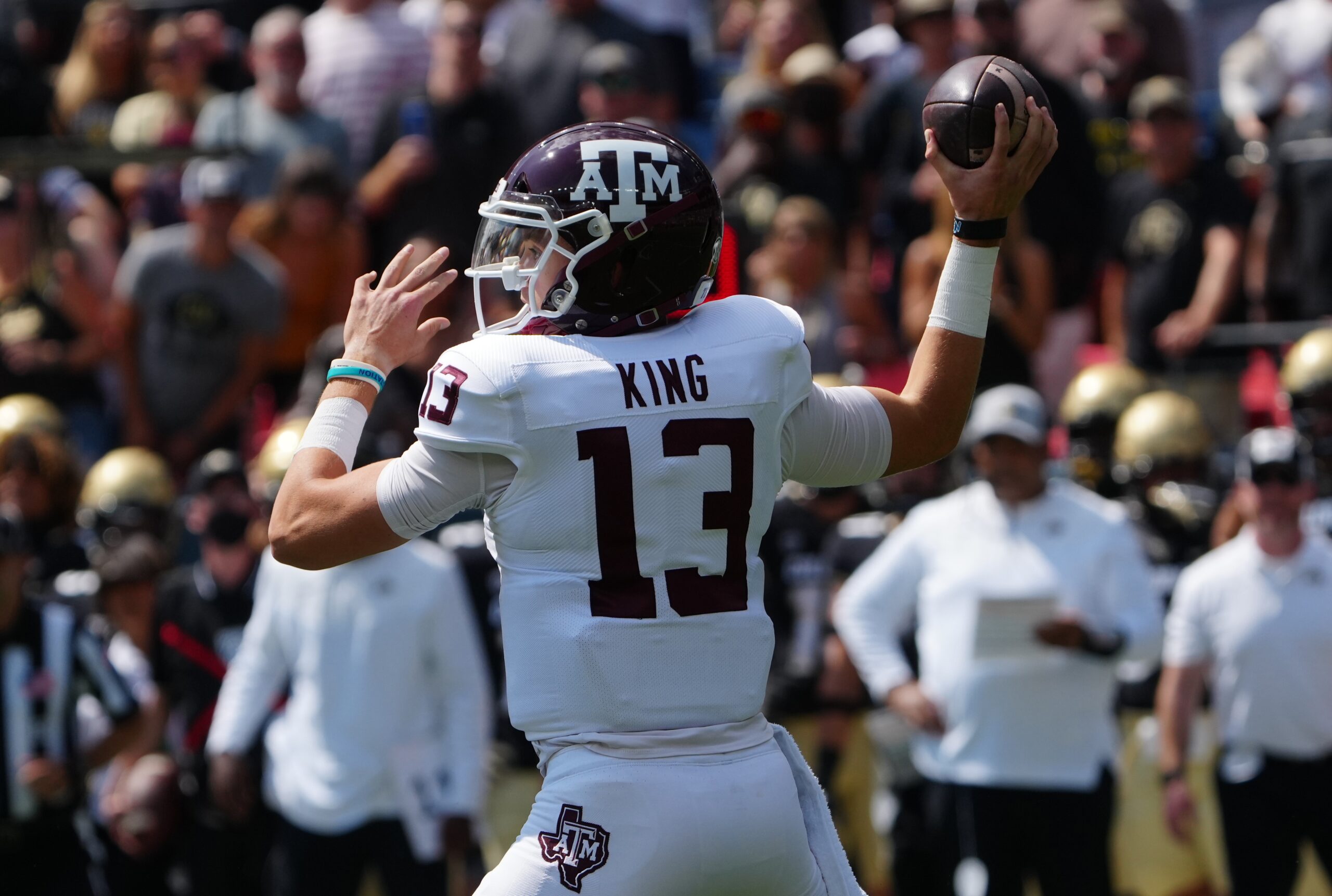 Texas A&M quarterback Haynes King left Saturday’s game against the Colorado Buffaloes with an apparent right leg injury.