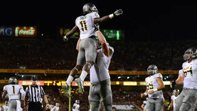 Oregon cornerback Ifo Ekpre-Olomu intercepted a Kelly pass on Arizona State’s next series, and Barner scored his second touchdown on a 1-yard run with 14:04 left in the half. After Arizona State was forced to punt, Mariota ran 86 yards untouched to score on an option play over the right side.