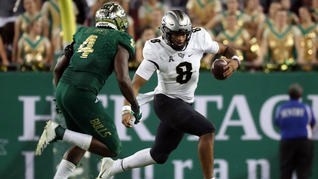 Mack, a sophomore, completed 51 of 100 passes for 619 yards, with three touchdowns and one interception. He also ran 69 times for 337 yards and six scores. Mack led the team to a 2-1 record in his three starts, with a 40-32 loss to LSU in the Fiesta Bowl snapping the Knights’ 25-game winning streak.